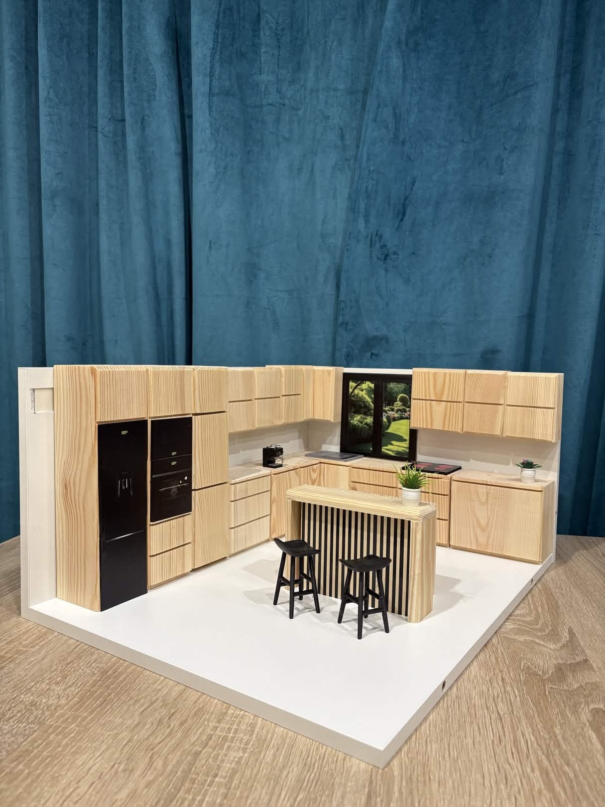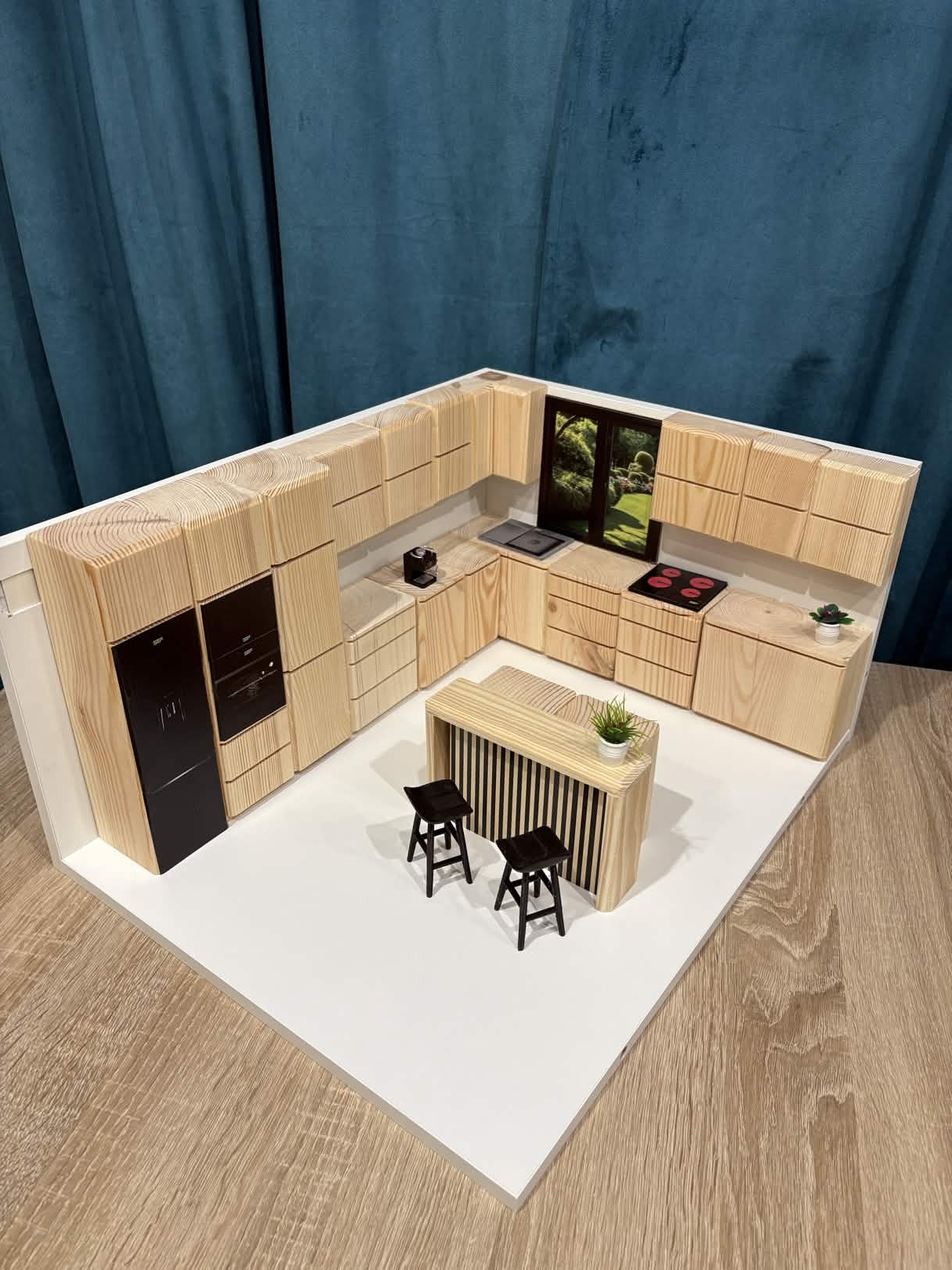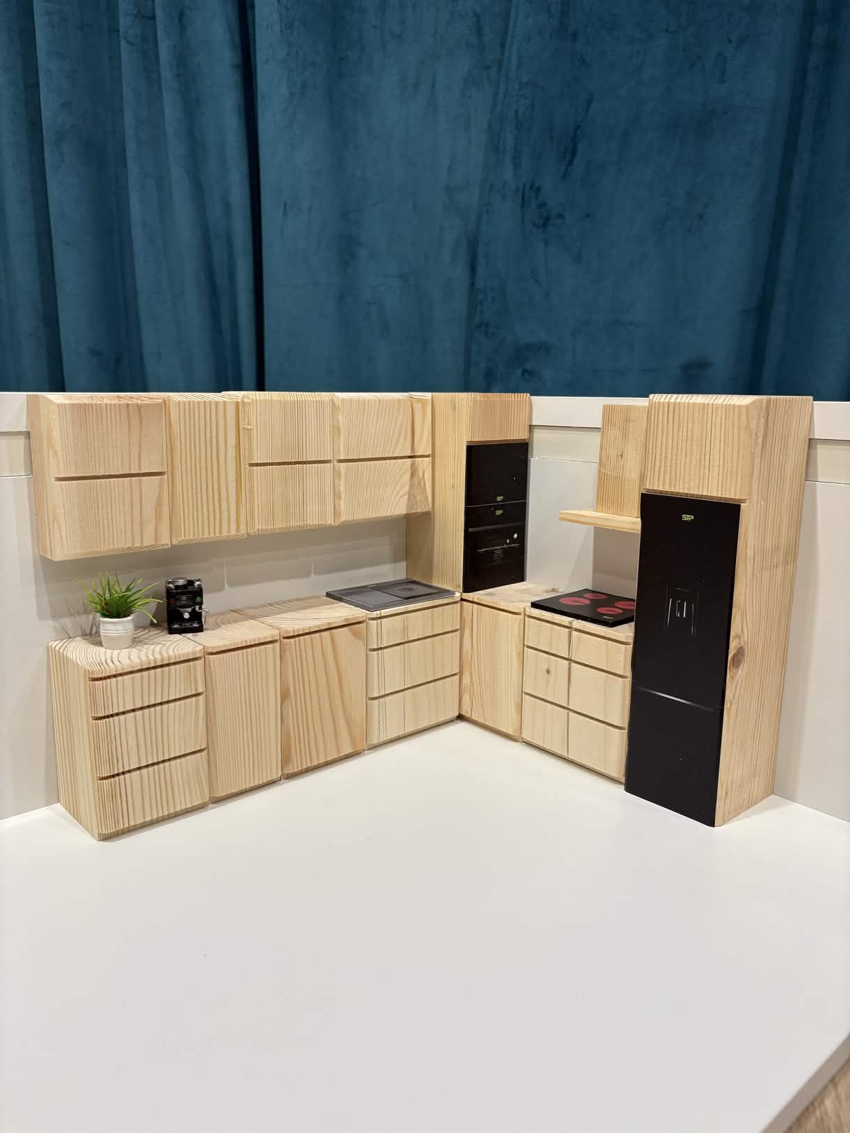 Zestaw 40 różnorodnych szafek i 6 dodatków w skali 1:10 (3D), wykonanych z frezowanego litego drewna.