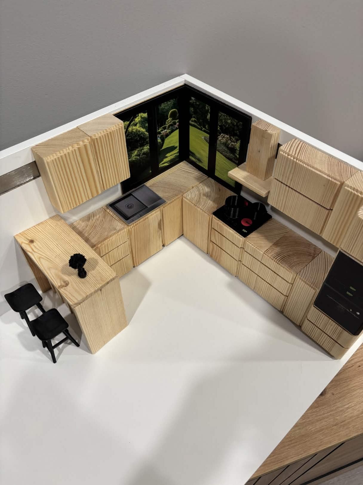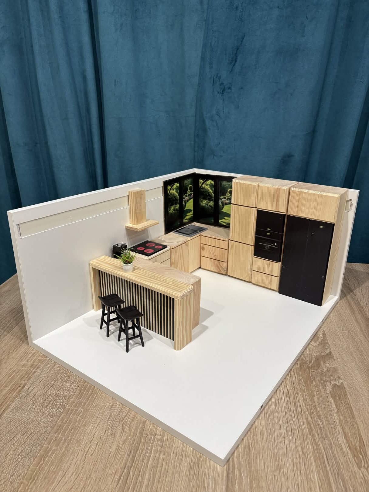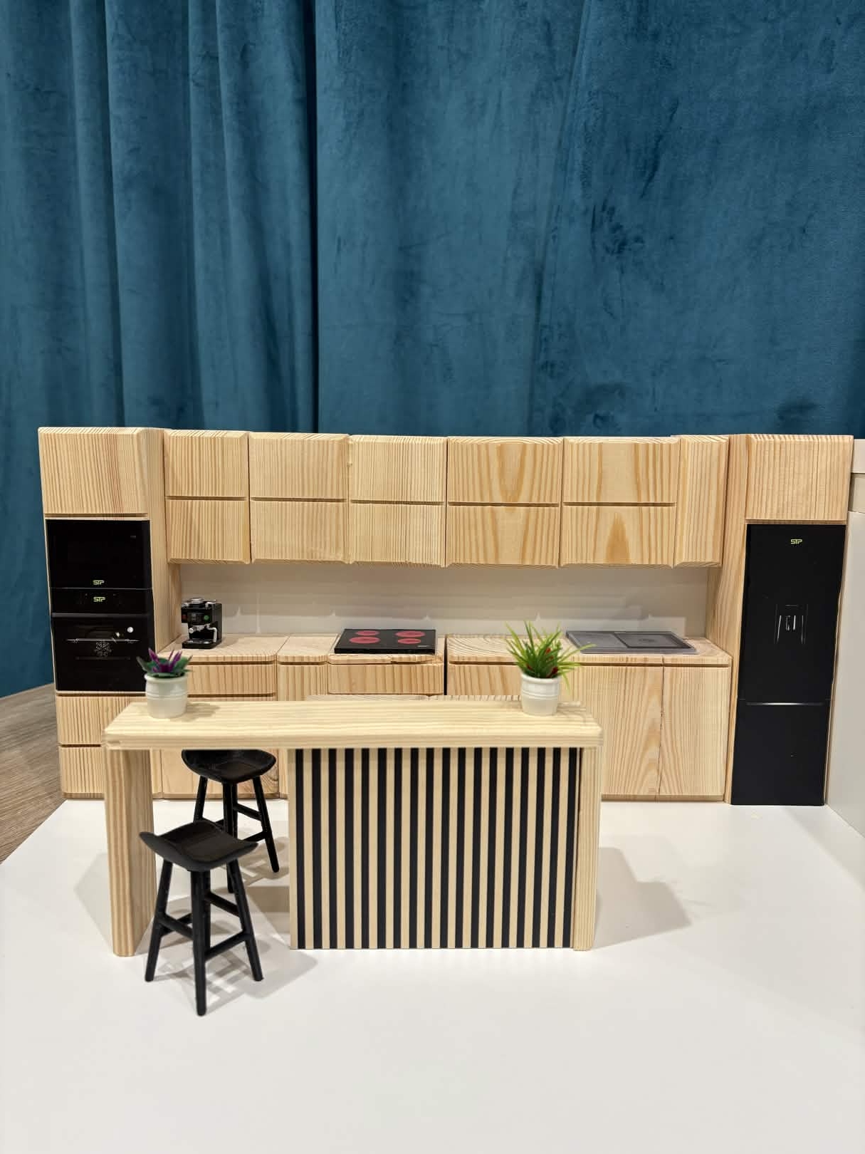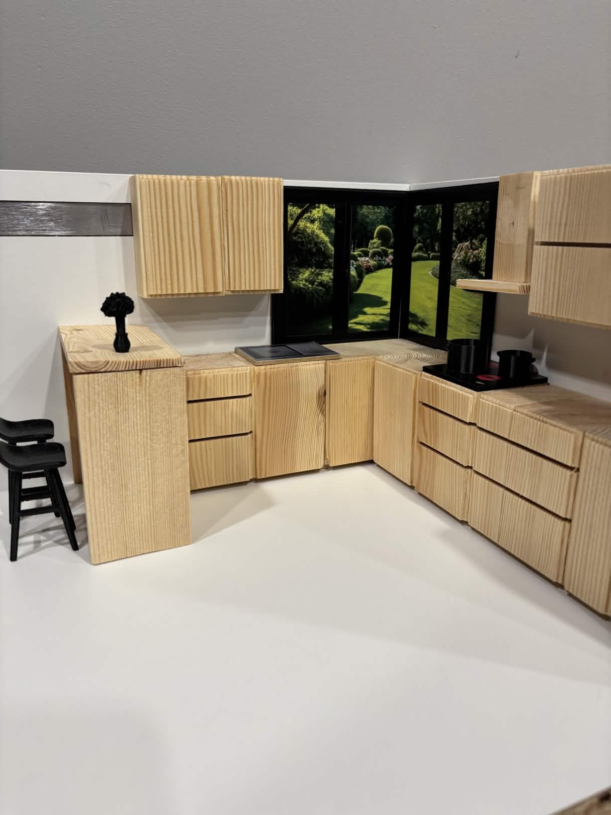 Zestaw 40 różnorodnych szafek i 6 dodatków w skali 1:10 (3D), wykonanych z frezowanego litego drewna.